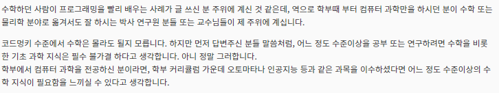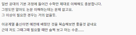 실제 개발자들에게 '개발과 수학의 관계'를 물으면, 수학을 꼭 잘할 필요는 없지만 수학적 논리력은 꼭 필요하다는 대답이 정말 많이 나온다. (수학을 잘할 필요는 없다의 의미가 '대학원생수준'으로 잘할 필요는 없다 라는 의미인 경우들도 있지만..) 하지만, 특정 분야(인공지능, 셰이더 등)를 개발하거나 논문을 이해하기 위해서는 수학을 어느정도 알아야 한다. '프로'개발자가 되기 위해서는 일정 수준 이상의 수학공부가 필요하다.