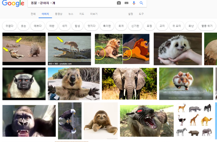 밑에 검색결과 이미지가 나오는거처럼 강아지, 고슴도치, 펭귄, 사자등