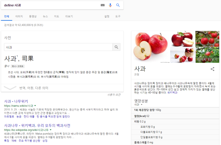우측에 사과 사진과 함께 사과의 사전적 정보가 표시되지만,