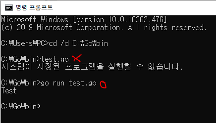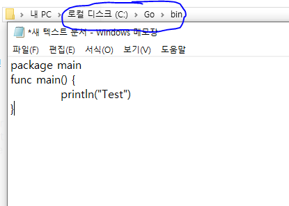 go언어를 테스트해보기 위해 'C:\Go\bin' 폴더에 다음과 같은 소스를 추가하고