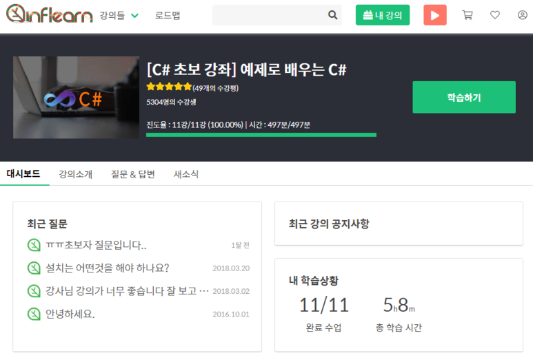 일단 필요한 부분만 설명해주셔서 쉽고, 예제 위주로 학습하니까 재미있습니다. 강의에 많은 내용은 없지만, 하나 하나가 정말 소중한 내용이라서? 짧게 C# 맛보고싶으신분들 이 강의로 일단 공부하시고, 더 공부하고싶으면 다른 강의 추가로 듣는거 추천드려요!