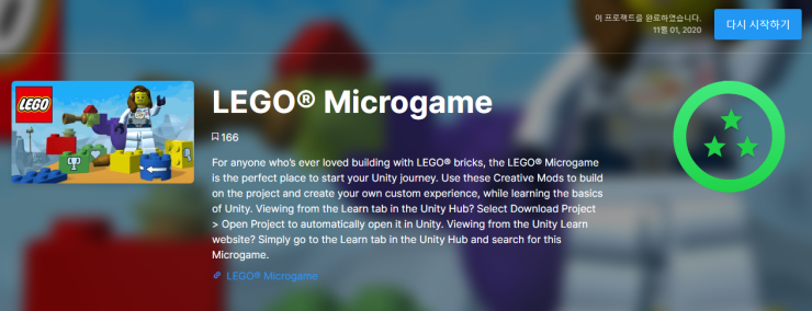 Unity Lego Microgame의 모든 튜토리얼을 완료하였습니다.