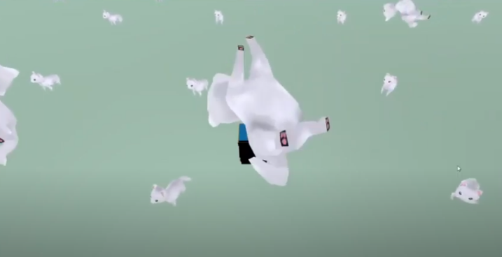 학습을 시작하기 전, 모든 관절에 랜덤한 값을 주어 움직이게 한 모습이다. 이때 Joint Driver의 미숙한 사용으로 버그가 있어서, 꼬리 관절이 초기화되지 않아 학습의 다음 Step에서 고양이가 하늘로 날라가는 버그가 있었다. 사진은 버그로 고양이가 날라가는 모습이다.