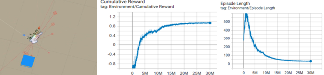 학습을 시작하고 자고 왔더니 고양이가 타겟(파란 네모)을 매우 잘 찾는 모습을 보여주었다. 학습방법이 미흡해도 근본적으로 잘못된 것이 아니라면 긴 시간 학습하면 원하는 결과가 나오는듯 하다. 보상(가운데 그래프)는 계속해서 증가하고 있고, Episode Length는 3M까지 증가하다가 이후 감소하는 그래프를 보여주고 있다. 3M번 까지는 넘어지지 않기 위해 균형을 잡는 법을 학습하고, 그 이후로 목표를 따라가는 학습이 진행된 듯 하다.