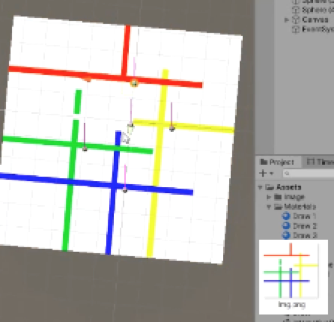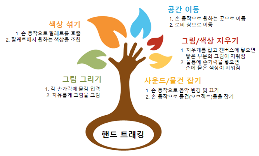 핸드트래킹을 이용하여 손가락으로 그림을 그린다. 손가락에는 특정 색상을 선택할 있으며, 선택된 색상으로 그림이 그려진다. 오른쪽에는 Sphere 오브젝트를 손가락으로 가정하여, 손가락에 빨강, 노랑, 녹색, 파랑, 흰색을 적용해 그림을 그린 모습이다. 그림이 그려질 캔버스가 흰색으로 설정되어 있어서 흰색이 그려진 그림을 지우는 지우개의 역할을 담당한다. 원래는 5손가락 모두 사용하여 그림을 그릴 있도록 계획하였으나, 핸드트래킹으로 그림을 그릴 예상치 못하게 그림이 그려지는 경우가 많아 검지(Index Finger) 사용해서 그림을 그리는 것으로 변경하였다.