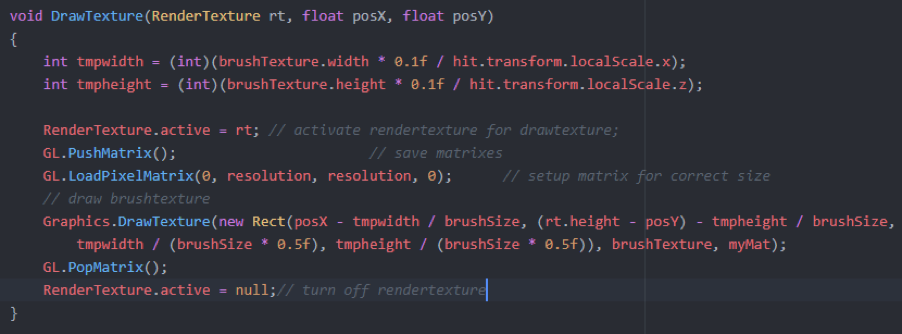 Raycast 충돌한 좌표에 준비된 bursh이미지를 DrawTexture 그린다. 이때 myMat 원하는 색상과 재질을 담고, brushSize 크기만큼 배율을 조정해 텍스처를 그린다.