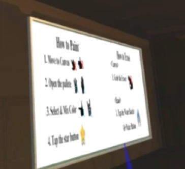 핸드트래킹을 이용하여 맵을 돌아다니며 캔버스(미니 캔버스와 메인 캔버스)에서 그림을 그릴 있다. 아기자기한 분위기를 위해 곳곳에 귀여운 오브젝트를 배치하고, 맵을 돌아다니는 고양이도 제작하였다. 스피커를 만들어 음악이 나오게 하였으며, 플레이어가 원한다면 음악을 끄고 어플리케이션을 사용할 수도 있다. 2층에 존재하는 포탈을 이용하면, 옥상으로 나가게 되는데 여기서 자유롭게 휴식을 하며 경치를 즐길 있다.