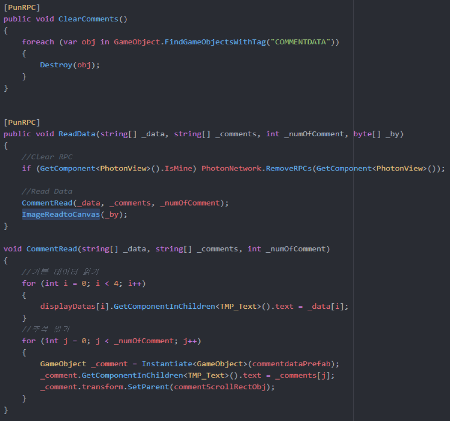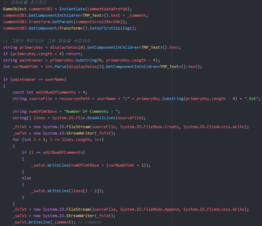 그림에 대한 코멘트를 작성함으로써 반응과 피드백을 있다. RPC 이용하여 실시간으로 모든 플레이어가 코멘트를 확인할 있고, 그림의 주인은 자동으로 파일이 업데이트된다. (페이지 조절상 Close함수와 파일스트림 선언은 생략했습니다.)
