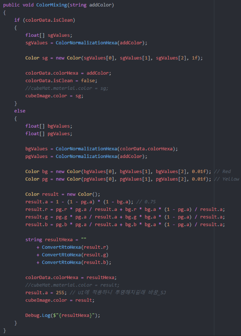 Color alpha값을 이용하여 구현하였다. 컬러값은https://trycolors.com/사이트를 참조해가며 만들기 위해 6자리의 헥사값의 문자열로 변경하여 제어하였다.
