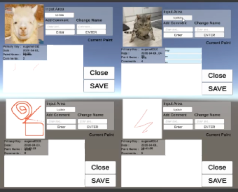 지금까지 그림 그림을 파일 저장기능을 이용해서 저장할 있다. 저장위치는 유니티 ‘Application.persistentDataPath’ 저장됨으로 기기 상관없이 파일을 저장하고 읽어올 있다. 기능은 다음에 소개할전시기능과 이어진다. 그림을 저장하고 읽어오는 과정에서 많은 부하가 발생하였는데, 유니티 프로파일러를 통해 프레임 타임이 많이 소요되는 기능을 찾아 코루틴의 동시프로그래밍(Concurrency Progtamming) 사용하여 최적화 하였다. 사진에서 화면으로 보이는 부분이 실시간으로 그림을 그리고 있는 캔버스이고, 우측 하단이 그림이 파일로 저장된 모습이다.