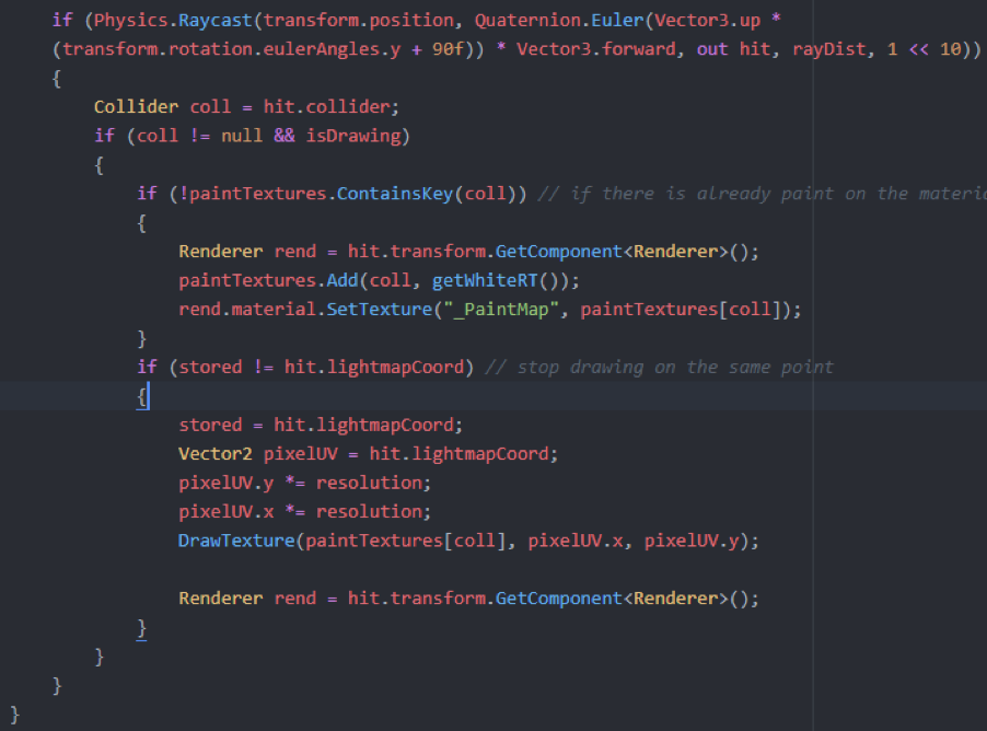 손가락에서 바닥(X,Z) 평행한 방향으로 Raycast 발사하고, 충돌한 대상이 그림을 그리는 Canvas(Layer:10) 그림을 그린다. 만약 처음 그리는 텍스처(!paintTextures.ContainsKey(coll) 때는 초기화 작업을 진행하고, 캔버스에 손가락이 움직인 경우(stored != hit.lightmapCoord) 그림을 그리기 시작한다.