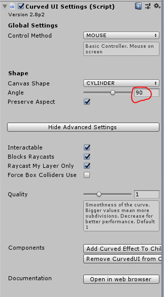 7. Canvas에 추가한 'Curved UI Settings' 컴포넌트의 Shape에서 Angle 조절해보기