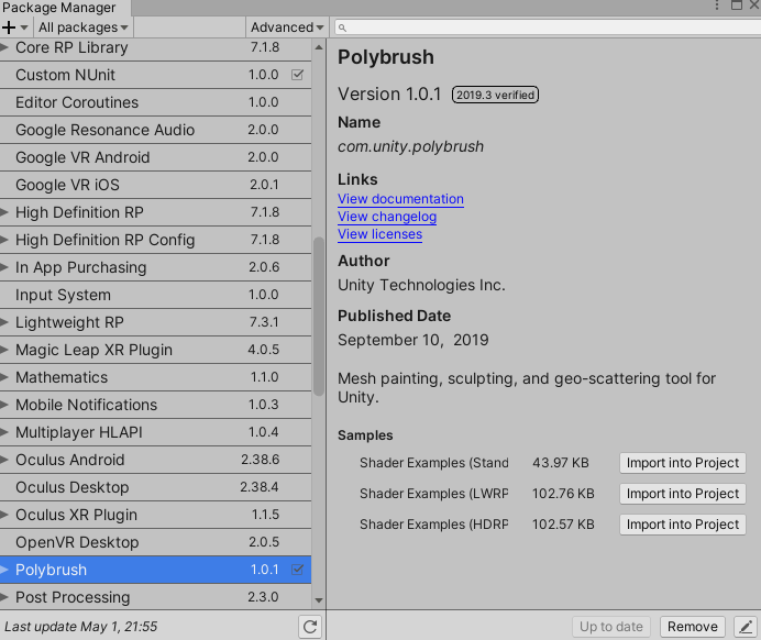 지금은 패키지매니저를 오픈하시고 PolyBrush를 검색하시면 쉽게 다운받을 수 있습니다.