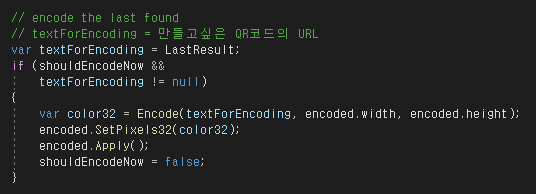동적으로 QR코드를 생성하는 코드는 이렇게 간단합니다. 'textForEncoding'에 생성하고싶은 QR코드의 URL을 넣어주시고 이렇게 코드를 실행시켜주시면 QR코드가 텍스처로 생성됩니다. 자세한 설명은 생략합니다.
