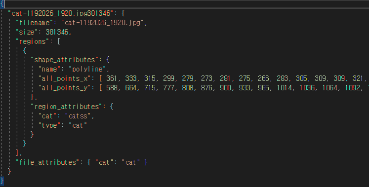 이미지에서 고양이가 존재하는 부분을 지정하고, 이를 'cat'이라는 속성을 정해준 뒤 export하면 다음과 같은 json파일이 나온다. 이제 머신러닝 모델을 만들때 이미지와 고양이의 위치가 지정된 json파일을 이용하여 인공지능 모델을 학습시킬 수 있다. 이렇게 학습된 인공지능은 이미지나 영상에서 고양이가 어디 위치해있는지 찾아내고, 고양이만 흑백으로 만든다던가 고양이 이외에 배경을 없앤다던가 하는 작업을 자동으로 수행할 수 있게된다.