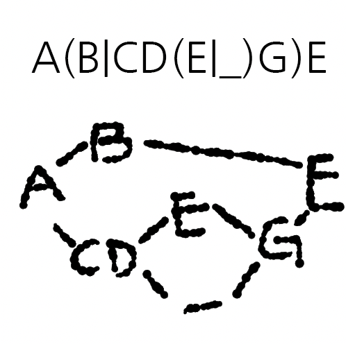 위 입력 예시에서 무어 기계가 가질 수 있는 상태는 총 3가지(ABE, ACDEG, ACD_G)가 있다. 이때 '_' 값을 알아내기 위해서는 입력된 출력값이 'ACD[A-DF-Z]G'의 형태를 가져야 하며, 'ABE, ACDEG'와 같이 입력되면은 무어기계의 출력값은 맞지만 '_'값을 유일하게 식별할 수 없으므로 '_'를 출력해야한다. 이 두가지 상태를 합치면 'ACD[A-Z]G'라는 정규식을 얻을 수 있으며, 이 정규식에 매칭되지 않으면 무어기계의 출력이 아니므로 '!'를 출력하면 된다. 이때 아래와 같은 순서로 진행하면 'ACD[A-DF-Z]G'정규식을 생략하고 알고리즘을 작성할 수 있다.