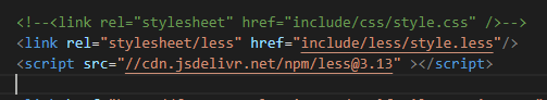 책에서는 less파일을 simpleLess툴을 사용해 컴파일하고, 프로젝트의 css폴더 안에 컴파일된 css파일을 넣어 실습을 진행하는 것처럼 보이는데, 나는 node.js를 통해 최신버전의 less를 다운받고 html에서 less폴더 안에 있는 style.less파일을 직접 연결하여 사용하였다. 이처럼 진행하기 위해서는 아래 사진처럼 header를 작성하면 된다. (주석처리된 부분이 기존 책에서 사용하는 예제의 코드이고, 아래 있는 두줄의 코드가 새로운 방법으로 .less파일을 적용하는 방법이다.)