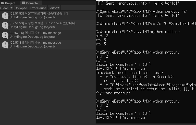 클라이언트 PC에서 파이썬으로 MQTT 메시지를 송신 → 서버PC의 MQTT브로커 → 클라이언트 PC의 유니티가 MQTT 메시지를 수신