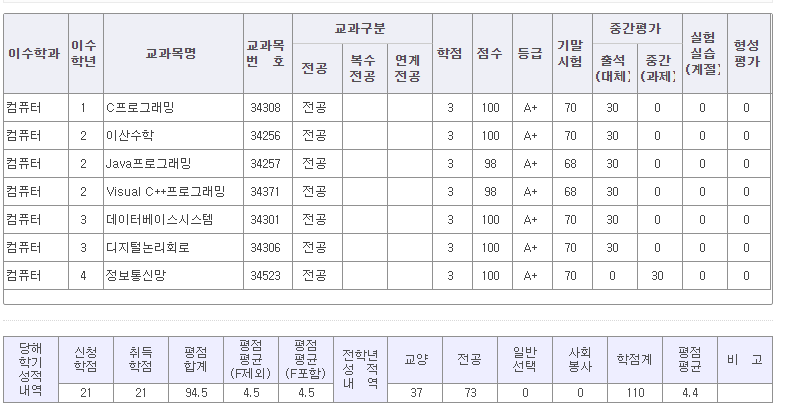 7전공 99.4점 정도의 점수를 받아서 4.5(A+)학점을 얻게 되었다.