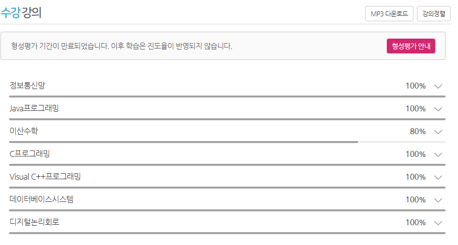 방통대 과목은 아니지만.. 졸업인증용으로 이번 학기에 정보처리기사 자격증을 취득했다. 정보처리기사를 공부하면서 방통대 수업을 듣기 위해 정보처리기사 맞춤용으로 1학기 과목들을 구성하였다. C, Java, 데이터베이스시스템, 정보통신망이 정보처리기사 범위에 해당하는 과목이다. 나는 다음 학기 계획도 있어서 정보처리기사와 관련 없는 2과목도 수강했지만, 7과목을 정보처리기사 과목으로 꽉 채우자면 컴퓨터보안, 소프트웨어공학, 운영체제같은 과목도 같이 듣는다면 정처기에 큰 도움이 될 것이다.