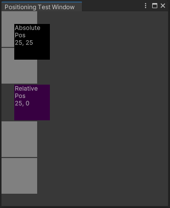 위 예제는 상대 위치 지정과 절대 위치 지정 간의 차이를 보여줍니다. 자동 레이아웃 시스템을 사용하여 창에 box를 추가하고 위치를 계산합니다. 한 box는 상대 오프셋(25,0) 을 보여주고, 한 상자는 절대 오프셋(25,25)를 보여줍니다.