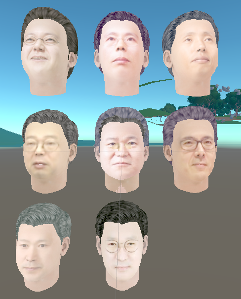 교수님들을 3d공간안에 불려오려고 했지만.. 여러가지 이유로 적용을 포기했다. 먼저 이미지를 3d 모델로 바꾸는 소프트웨어의 무료 평가버전을 이용했는데, 저렇게 8분을 변환하고 나니 무료 사용량이 초과하여 더이상 모델을 바꾸지 못하는 일이 일어났다. 김진욱 교수님을 이세계에 불러오지 못한 것이다. 두번째로 모델이 너무나도 무거웠다. 저 8분을 소환하고 나니 씬의 용량이 1기가에 달할 정로도 무거워져서.. 도저히 사용하지 못할정도의 용량이라 깔끔하게 3d모델을 포기하고 모델에 이미지를 덧붙히고 빌보드 처리하는 방식으로 진행할 예정이다.. 교수님들을 3d로 표현하려고 했는데 정말 아까운 일이다.