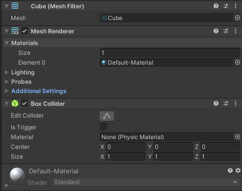메시의 메터리얼을 조정하여 메시의 모양을 완전히 바꿀 수 있습니다. Unity의 기본 메터리얼은 단순한 흰색 단색입니다. 새 메터리얼 생성시 기본적으로 Unity의 스탠다드 셰이더를 사용하며, 이를 통해 표면의 시각적 동작 방식을 조정할 수 있는 일련의 컨트롤을 제공합니다.