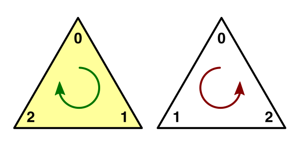 삼각형이 어느 쪽에서 보이는지는 정점 인덱스의 방향에 따라 결정됩니다. 기본적으로 정점 인덱스가 시계 방향으로 배열된 경우 삼각형은 정면을 향하고 보이는 것으로 간주됩니다. 시계 반대 방향의 삼각형은 버려지므로 일반적으로 보이지 않는 오브젝트의 내부를 렌더링하는 데 시간을 소비할 필요가 없습니다.