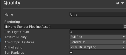 비등방성 필터링이 얼마나 적용될 지는 Aniso Level로 제어됩니다. 1이면 활성화되어 최소한의 효과를 제공합니다. 16에서는 최대 효과를 제공합니다. 그리고 이러한 설정은 프로젝트의 quality setting의 영향을 받습니다.