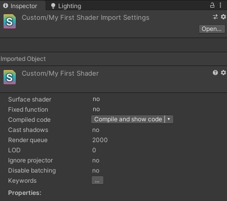 에디터에서 셰이더를 선택하고 인스펙터 창을 살펴보세요. 현재 컴파일러 오류를 포함하여 셰이더에 대한 몇 가지 정보가 표시됩니다. 컴파일 및 코드 표시 버튼과 드롭다운 메뉴가 있는 컴파일된 코드 항목도 있습니다. 버튼을 클릭하면 유니티가 셰이더를 컴파일하고 에디터에서 그 출력을 열어서  생성된 코드를 검사할 수 있습니다.