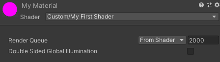 구 객체가 기본 메터리얼 대신 방금 제작한 자체 메터리얼을 사용하도록 변경합니다. 구가 마젠타색이 됩니다. 이 색상을 사용하여 문제에 대한 주의를 환기시키는 오류 셰이더로 전환되기 때문에 이런 일이 발생합니다. 셰이더 오류에 서브 셰이더가 언급되었습니다. 이를 사용하여 여러 셰이더 배리언트를 함께 그룹화할 수 있습니다. 이를 통해 빌드 플랫폼이나 디테일 수준에 따라 서로 다른 서브 셰이더를 제공할 수 있습니다. 예를 들어 데스크톱용 서브 셰이더와 모바일용 서브 셰이더가 있을 수 있습니다. 우리에게 이번 챕터에서 서브 셰이더 블록은 하나만 있으면 됩니다.