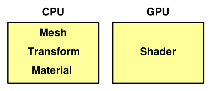 Transform컴포넌트는 메쉬와 바운딩 박스의 위치, 방향, 크기를 변경하는 데 사용됩니다. 실제로는 1부의 행렬 파트에서 설명된 대로 전체 트랜스폼 계층 구조가 사용됩니다. 오브젝트가 카메라의 시야에 들어오면 렌더링이 예약됩니다. 마지막으로 GPU는 오브젝트의 메시를 렌더링하는 작업을 수행합니다. 구체적인 렌더링 지침은 오브젝트의 메터리얼에 의해 정의됩니다. 메터리얼은 GPU 프로그램인 셰이더와 셰이더에 있는 모든 설정을 참조합니다.