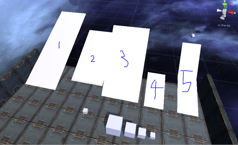 각도나 길이가 다른 5개의 판을 설치하고, 그 꼭대기에서 공을 굴러서 바닥에 닿는 순간