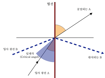 임계각 : θcritical = arcsin(n2/n1)