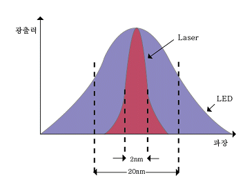 빛은 파장에 의해 각기 다른 량으로 굴절 된다. 위 사진은 LED와 Laser의 파장범위를 나타낸 것이다.이러한 범위로 인해 서로 다른 파장들이 존재하게 되며 이는 광섬유 내에서 속도차이를 발생시키는 원인이 된다. 이러한 분산을 크로매틱 분산(Chromatic dispersion)이라 한다.