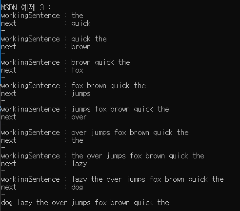 'dog lazy the over jumps fox brown quick the' 라는 결과가 출력됩니다.