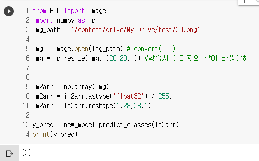 좌측에 손으로 '숫자 3'을 쓴 이미지를 구글 드라이브에 넣고, 그걸 코드로 읽어온 후 위에서 학습한 데이터를 바탕으로 이미지가 어떤 데이터를 나타내는지 추론해보도록 하겠습니다. 실행해봤더니 우측 이미지 하단에 '3'이라는 출력값이 나온 것을 확인할 수 있습니다! 이거 정말 좋군요